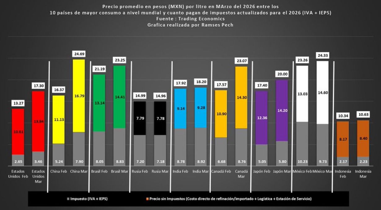 La razón es mucho más simple y mucho más incómoda: en México pagamos más porque aquí el impuesto a la gasolina es de los más altos del mundo entre los grandes consumidores.